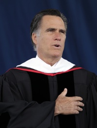 | Mitt Romney joins in the Pledge of Allegiance at Liberty University's commencement ceremony. (AP Photo) |