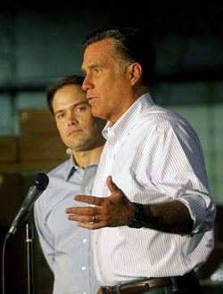 Mitt Romney speaks to the media during a campaign stop with Florida Sen. Marco Rubio.