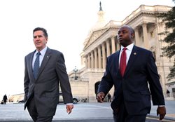 Tim Scott (right) leaves the weekly Senate Republican Policy Luncheon with Sen. Jim DeMint.