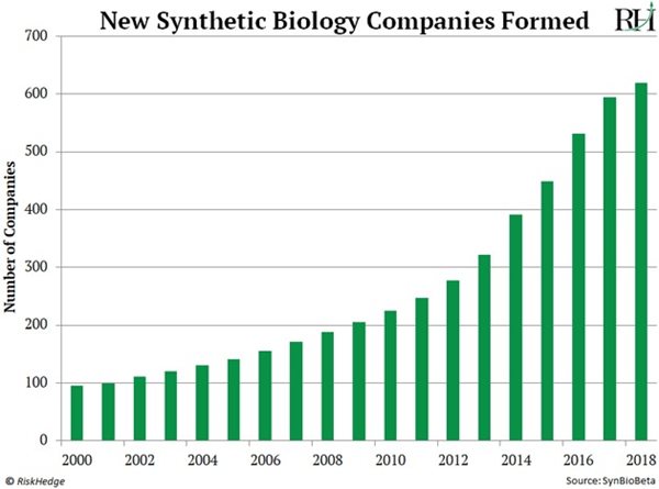 The number of new synthetic biology companies has also skyrocketed over the past two decades. In fact, there are now over 600 companies in the space. That’s up from less than 100 in 2000.