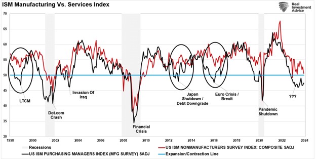 To understand why such is the case, we must first review why the current economic environment remains stronger than anticipated. In mid-2023, we discussed how the massive monetary infusions supported economic activity, and we were experiencing a “manufacturing” recession but not an economic one.