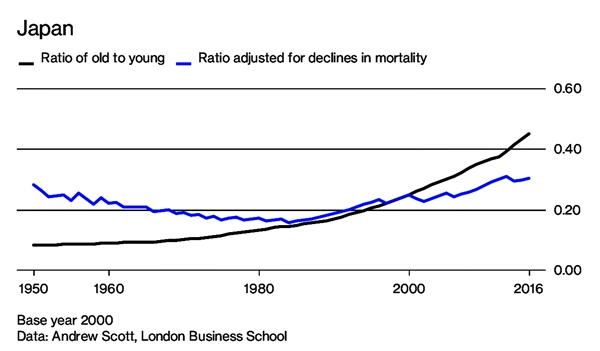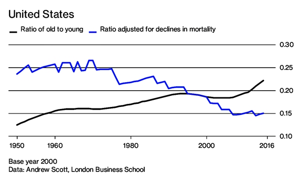 But that ratio is misleading and overly discouraging because it doesn’t take into account the decrease in mortality rates at older ages, says Andrew Scott, who is an economist at London Business School and co-author of The 100-Year Life: Living and Working in an Age of Longevity. Old people are less likely to die—and thus, presumably healthier and more capable of continuing to work—than they were in past generations, Scott wrote in a recent article for Project Syndicate called "The Myth of the ‘Aging Society.’"