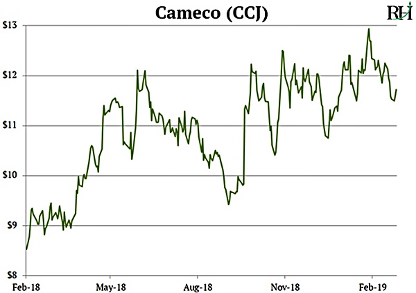 I recommended Cameco to you in August. It has climbed 10% since then. And it’s up 30% in the past year: