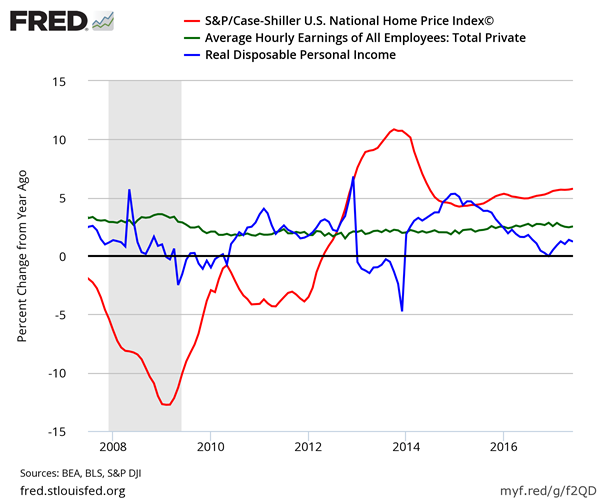 Meanwhile, home prices are outpacing wage growth, which has echoes of the subprime bubble that peaked in 2006. Banks and other financial services firms fueled the bubble with lax lending standards that granted loans to people who had little or no ability to repay them.