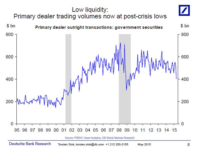 in U.S. Treasurys is for the moment at a post-crisis low and continuous to fall further, according to Deutsche Bank Research.