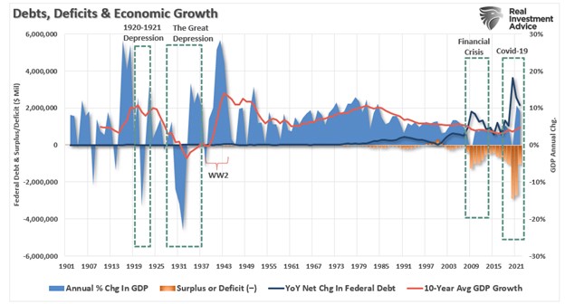 Over the coming decades, the massive surge in unproductive debt will increase deflationary pressures and slower economic growth. These issues are not new but have plagued economic growth for the last 40-years. The result is that debts and deficits will continue to detract from rather than contribute to economic growth. As shown, the surge in debt and deficits coincides with a peak in the 10-year average economic growth rate.