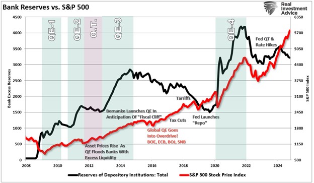 As such, an asset swap, in this case, a digital accounting mechanism, does not create money. However, it does boost reserves to the financial system, as shown below. While banks should lend those reserves to the economy, that has not happened. Instead, those reserves have found their way back into the financial markets.