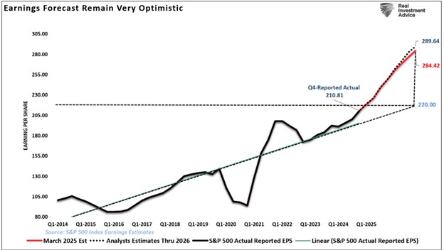 “Again, this is because earnings are a function of economic activity. Therefore, for earnings to match current estimates, expectations for economic growth must improve sharply. However, such seems unlikely given the impact of tariffs and reductions in government spending and employment. Therefore, it is far more likely that we will eventually see a sharp decrease in forward estimates.”