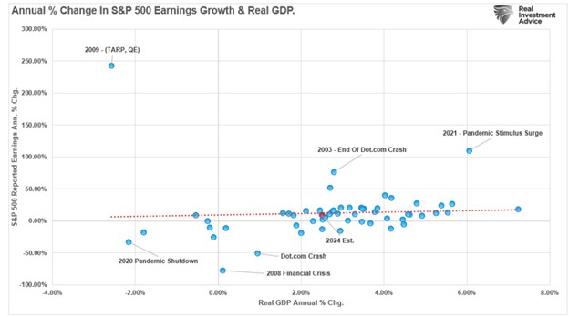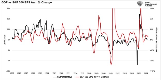 Therefore, given that earnings come from economic activity, slower economic growth will eventually impact earnings expectations. To better understand this concept, we can look at the correlation between annual changes in earnings growth and inflation-adjusted GDP. There are periods when earnings deviate from underlying economic activity. However, those periods are due to pre- or post-recession earnings fluctuations. Economic and earnings growth are very close to the long-term correlation, but a slowdown will change that.