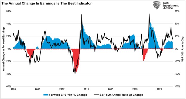 Given the high correlation between earnings and economic growth, it is essential to pay attention to that relationship. While it is possible for the markets to temporarily detach from underlying economic realities due to momentum and psychology, ultimately, the market can not outgrow the economy. This is why we pay close attention to the direction and trend of annual change in both markets and earnings estimates. Currently, forward earnings estimates are still expansionary and are not warning of an economic recession…yet.
