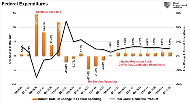 As shown, Federal spending has returned to the post-financial crisis exponential growth trend as the Government continues to use “Continuing Resolutions” to fund the Government. These resolutions, like the one just passed last week, automatically increase government spending by 8% annually. In other words, spending doubles every nine years, which is why debt levels continue to increase. However, that spending increase feeds into economic growth rates.