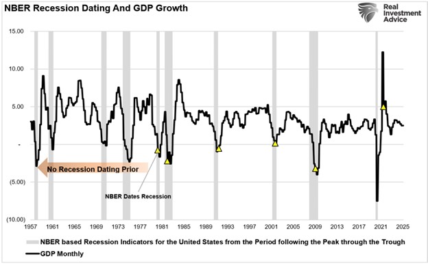 The problem with predicting recessions is that economists always work off of lagging economic data. Such is particularly the case with GDP, which is revised three times following the end of the quarter, 12 months, and 3 years later. Historically, given that lag, the timing of U.S. recessions can be off by 9 to 12 months before they are recognized by the National Bureau of Economic Research (NBER). The chart below shows the lag between the onset and recognition of previous U.S. recessions.