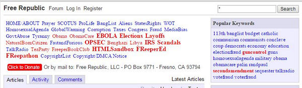 5. Free Republic - “Working to roll back decades of governmental largesse, to root out political fraud and corruption,” and “always have fun doing it. Hoo-yah!” Free Republic might just be the national bulletin board for the Tea Party, among serving other functions. Thousands of “Freepers,” with handles like Alamo Girl and cripplecreek, link to articles other sites usually miss, then post endless pithy commentaries. Typical is a recent post by GreyFriar on the FCC turning the Internet into a public utility: “The Democrat version of democracy means three unelected bureaucrats voting for something that none of us is allowed to see.”