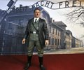 Behind the Nazi dictator’s figure was a backdrop depicting the Auschwitz concentration camp, with the slogan “Arbeit Macht Frei” — “work sets you free” — inscribed above the camp’s front gates.
