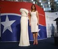 The gown, designed by Herve Pierre in collaboration with Mrs. Trump, featured a slit skirt, ruffled accent trim from the neckline to the hem and a claret ribbon around the waist. The first lady wore it as she accompanied President Donald Trump to celebratory balls on Jan. 20.