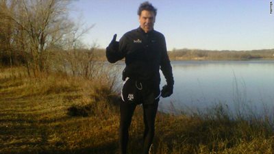 He's attached a photo of himself jogging near a lake, wearing Texas A&M running shorts and giving a thumbs-up.