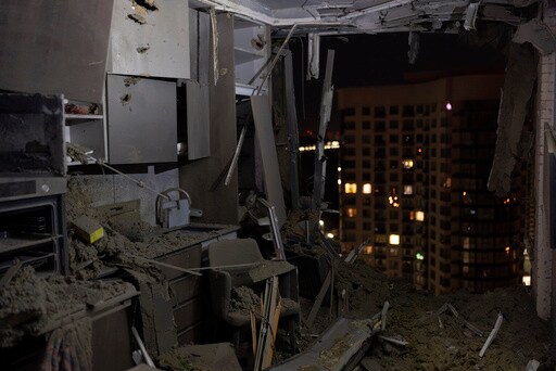 KYIV, Ukraine (AP) — Russian forces unleashed a barrage of self-exploding Iranian-made Shahed drones early Thursday morning, according to the Kyiv City Administration. Nearly ten drones were identified and shot down, the municipal authorities wrote on Telegram. Explosions were heard in different parts of the city, and debris from intercepted drones fell on five districts of the Ukrainian capital. Some buildings were damaged, and two people hospitalized with shrapnel wounds.