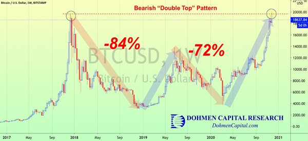 Cryptocurrencies in general plunged 75% to 100% from their euphoric highs in December 2017 to their lows just one year later. Bitcoin retreated from nearly $20,000 to below $3,200, depending on what market price is used. At that 2017 high, analysts in the financial media were hyping up these digital coins every day, forecasting rises to $50,000, $100,000, and even higher. Predictably, that euphoria marked the top.