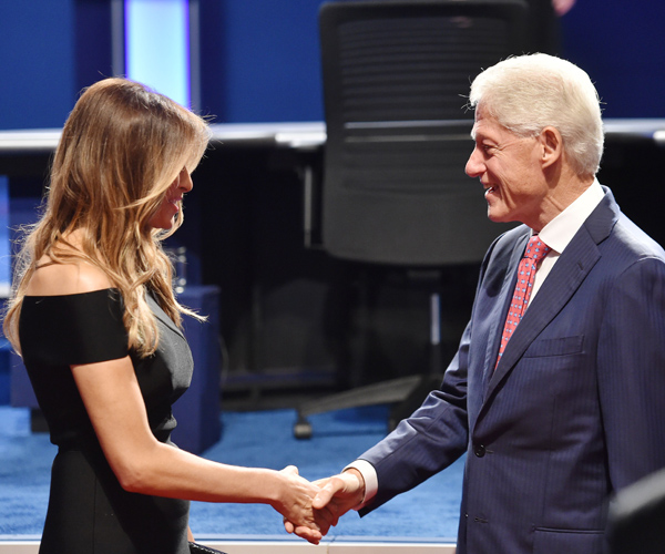 Melania Trump and former President Bill Clinton shake hands before the first presidential debate at Hofstra University in Hempstead, New York, on September 26, 2016. (Paul J. Richards/AFP/Getty Images)
