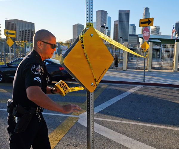 4. Threat shuts down Los Angeles schools — A police officer puts up yellow tape to close the area outside of Edward Roybal High School in Los Angeles on Tuesday morning after officials received a threat. The email threat, which gave some 640,000 students the day off, reportedly contained some glaring errors — for example, Allah was spelled with a lowercase "a" at one point — and was later found not to be credible. New York officials received a similar communication, but kept schools in session. (AP Photo/Richard Vogel)