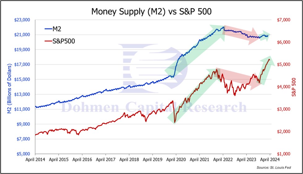 A trend change from declining to rising money supply is important. Artificial money injections by the Fed creates “loose money,” which breeds inflation and speculation.