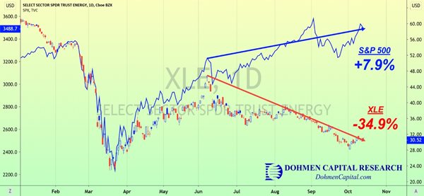 Since the “internal top” on June 8, the S&P 500 has jumped 9.3% while the XLE Energy sector ETF has plunged 33.9%. Talk about a divergence!