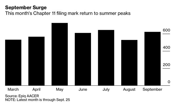 Layoffs may save companies money, but that doesn’t mean they’ll be in good shape any time soon. Filings for Chapter 11 bankruptcy increased once again in September to approach the levels we saw just two months prior in July, as shown on the chart below (via Epiq AACER):