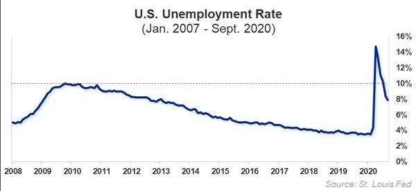 According to the latest report from the BLS, the U.S. economy added 661,000 jobs to nonfarm payrolls in September while the unemployment rate fell to its lowest level since the start of the pandemic, at 7.9%.