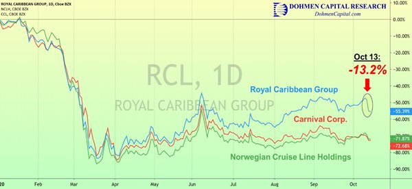 On Tuesday, October 13th, shares of Royal Caribbean (RCL) fell 13.2%, their largest single-day decline since June, after the company announced that it was raising $1 billion in a new equity and senior debt offering. Despite leading its peers year-to-date, as shown on the chart below, Tuesday’s plunge closed a significant portion of this gap. All three cruise stocks are currently down between 55-78% year-to-date.