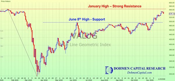Furthermore, the VALUG Index, which we believe to be more important than the S&P 500 since it incorporates over 1600 stocks using an equal-weighting method, is now very close to its February high. It is not influenced by the disproportionate weighting of the mega-caps in the other widely watched indices. Below is its daily chart: