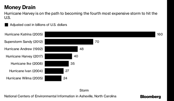 Harvey’s cost could mount to $24 billion when including the impact of relentless flooding on the labor force, power grid, transportation and other elements that support the region’s energy sector, Chuck Watson, a disaster modeler with Enki Research, said by phone on Sunday. That would place it among the top eight hurricanes to ever strike the U.S.
