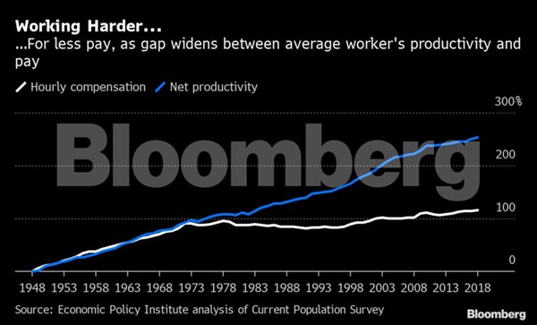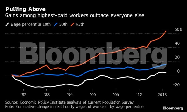 In the 11th year of a record expansion, the rising tide of the U.S. economy hasn’t been lifting all boats equally –- at least when it comes to pay.