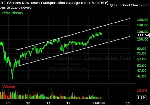 Given that IYT was selling for $111 at the time the chart was drawn, this means share prices could advance another 26 percent from current levels. That means there is a lot more spunk left in this bull market before we reach "overbought" or "lofty" prices. Remember this when you hear analysts howl about modest corrections, or Syria, or sequestrations or shutting down the government.