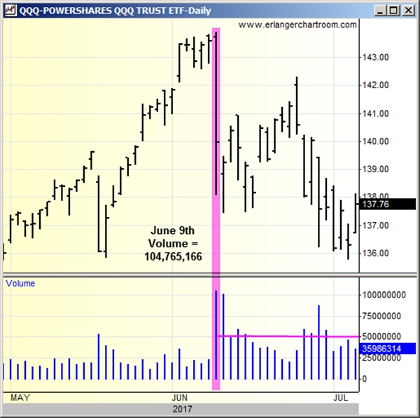 On June 9th, QQQ volume was 104,765,166 shares. The following Monday June 12th, QQQ volume was 101,009,505 shares. Monday was also a day that saw weakness and the QQQ drop -0.54%. Since those days, volume has remained heavy. June 29th saw a drop of -1.74% on the QQQ and volume was 87,153,362 shares.