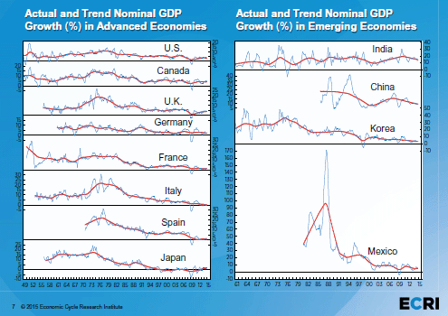 When we take a look at the actual and trend of nominal GDP growth (percentage) in advanced and emerging economies as published by the Economic Cycle Research Institute (ECRI) we see the U.S., Canada and the UK all continue to show stable relatively good growth patterns, while the 4 big eurozone economies (Germany, France, Italy and Spain) plus Japan display lackluster patterns and the big emerging economies China, India, Korea and Mexico still face downward