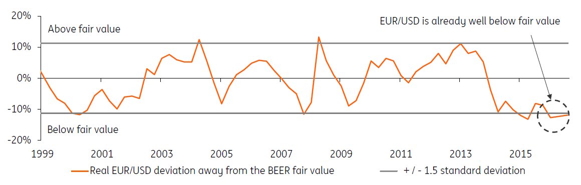 Anyway, the Dutch bank ING writes that they think that the euro versus the dollar is currently trading around 12 percent below its fair value, which has also held the euro back from falling below 1.05 dollar per euro this year.