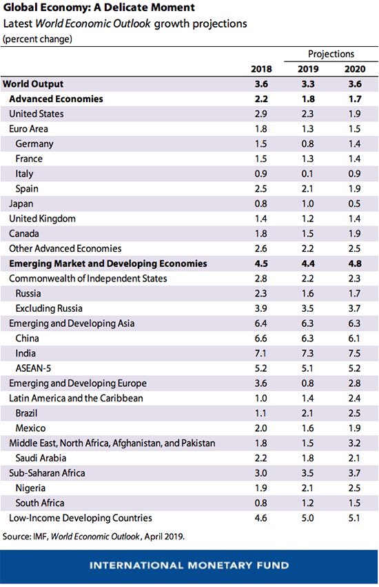 Yesterday, the IMF lowered its global growth forecast for 2019 to 3.3 percent from the previous level of 3.5 percent in its latest World Economic Outlook (WEO). It also projects a decline in growth this year for 70 percent of the global economy, but for China it projects it to grow by 6.3 percent this year, which is up from 6.2 percent it projected earlier.