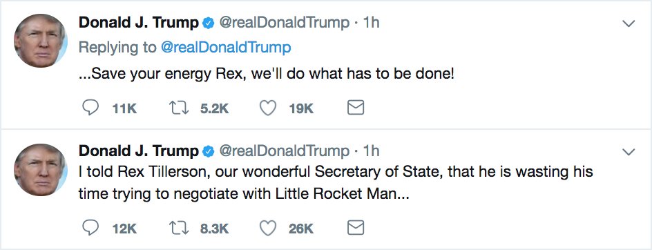 - The Trump twitter feed has been active again. Specifically, attempts by the Secretary of State Tillerson to negotiate with North Korea in a conventional diplomatic manner have been undermined by a couple of Trump’s tweets.