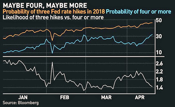 Meanwhile, the probability of four Fed rate hikes this year hit a new high. The market-implied probability of 4 or more hikes is now about 1 in 3. Still, 3 rate increases are seen as more likely, but that right tail is getting fatter as stocks continue to rally.