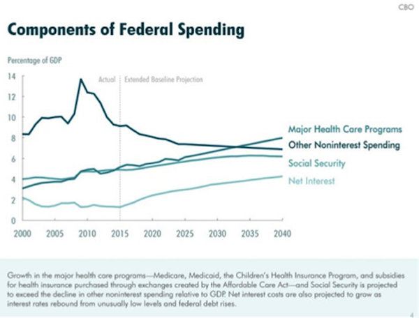 Let me explain why this is inevitable. As the Congressional Budget Office has pointed out, age-related healthcare costs and the associated debt service are the only part of the federal budget that’s growing in proportion to the whole. (Increases of approximately 9% in these programs are mandatory and automatic.)