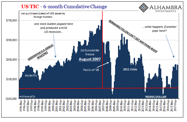 Thus, the conditions of today are very much like 1999 except for that one vitally important difference. Eighteen years ago, the dot-com bubble popped and did mild damage with the eurodollar system fully behind it (the shadows). If the current stock bubble pops, which now the out-of-office-Yellen suddenly realizes valuations aren’t ideal, she says it won’t matter much because “we have a much stronger financial system”, one that “has a lot of liquidity.”