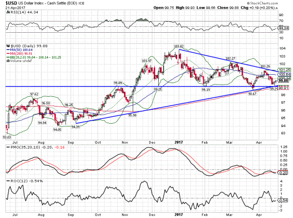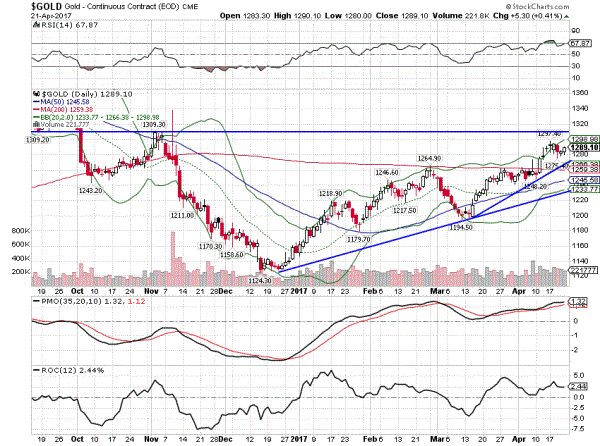 US growth expectations continue to wane. Interest rates and the dollar are falling, gold is rising. Stocks have stalled since the beginning of March as investors and traders reassess the political situation. That’s true on a global basis as well; the French election could conceivably have an impact on markets by the time you read this. I don’t think so and if it does it will probably be short lived but it could conceivably move markets.