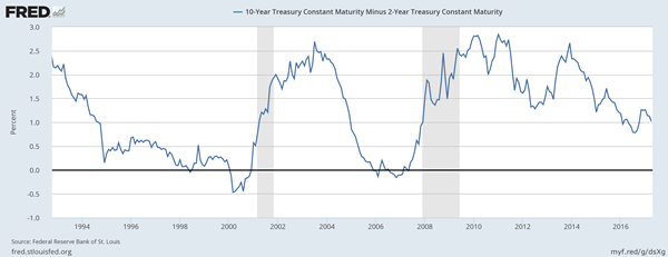 The weakness is also reflected in our market based-indicators. The yield curve flattened by 7 basis points since my last update and now 32 basis points since peak Trump euphoria steepness in mid-December. The 10/2 curve is still steeper than it was last August but all the steepening since the election has been reversed.