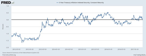 The recent dollar weakness has been a positive for gold, another sign of growth skepticism. Gold resumed its long term uptrend in 2016 and the short term trend is now higher too. Pretty stiff long term resistance will come in – assuming the rally gets that far – at around $1400; short term resistance is much closer by. The gold uptrend is supported by 5 year TIPS yields that recently turned negative again. Not much opportunity cost for holding the yellow metal.