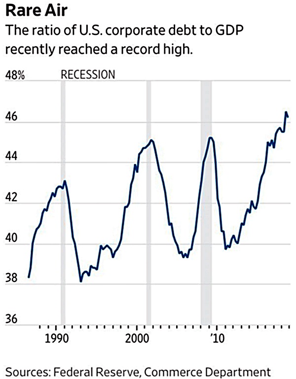 The result: Corporate debt as a percentage of GDP is now at a record high. And as the chart below shows, debt at these levels tends to end with a recession.