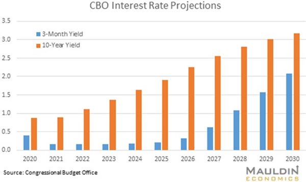 CBO expects a steady rise in the 10-year bond yield after 2021. Note, the government’s borrowing costs depend heavily on the maturity at which debt is issued and then rolled over. (Since no one expects the government to actually pay it down.)