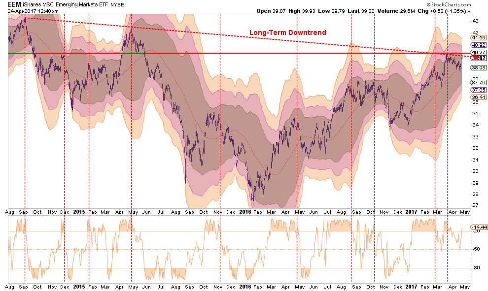 Emerging markets have had a very strong performance and have now run into the top of a long-term downtrend live. The strengthening of the US Dollar will weigh on the sector and will only get worse the longer it lasts. With the sector overbought, the majority of the gains in the sector have likely been achieved. Profits should be harvested and the sector under-weighted in portfolios. Long-term underperformance of the sector relative to domestic stocks continues to keep emerging markets unfavored in allocation models for now.