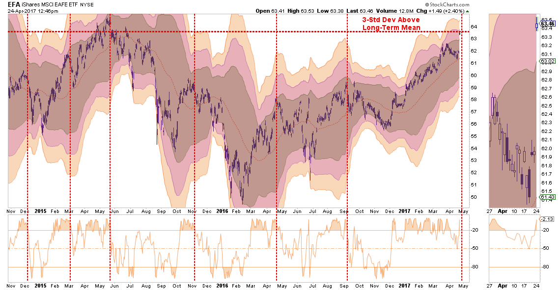 As with Emerging Markets, International sectors also remain extremely overbought and unfavored in models due to the long-term underperformance. With the international sector now trading 3-standard deviations above the long-term mean, take profits and rebalance to portfolio weightings for now.