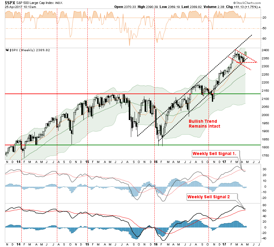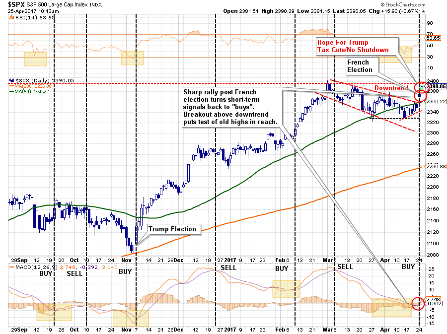 As stated above, the S&P 500 is extremely overbought, extended and exuberant. However, with a “sell signal” currently in place, there is a reason for some near-term caution. The French Election sparked a massive short-covering rally, the big question now will be the ability for follow through. The market will need to break out to new highs to end the current consolidation process.