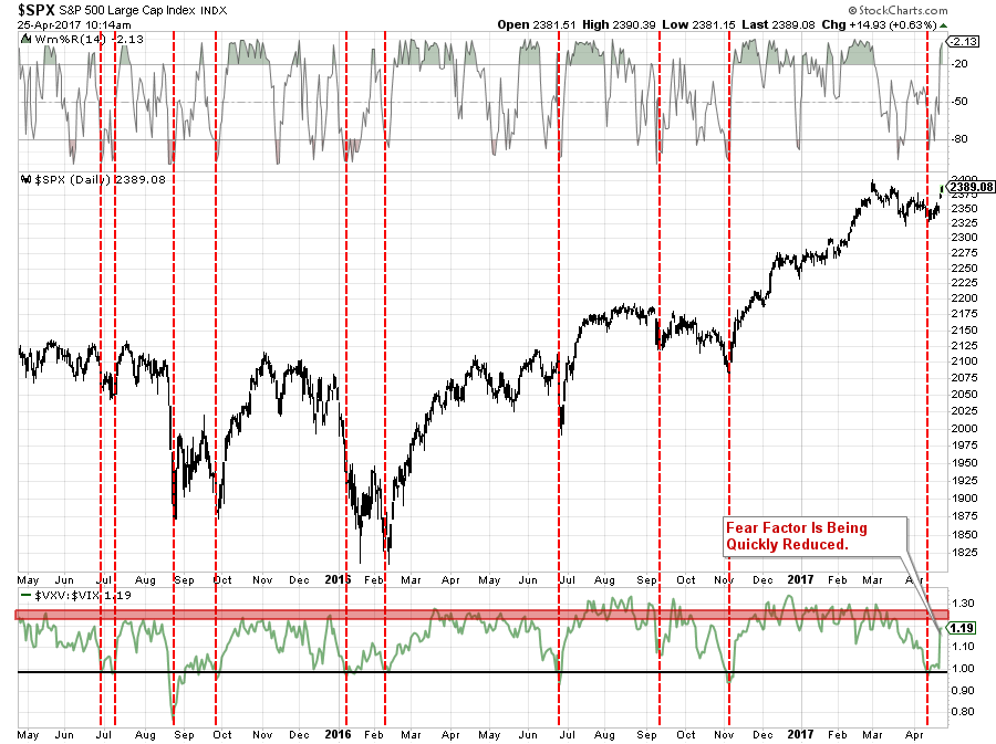 “The chart below is the ratio between the 3-Month Volatility Index and the Volatility Index (VIX). As shown, when this ratio declines to 1.00, or less, it has generally coincided with short-term bottoms in the market.”